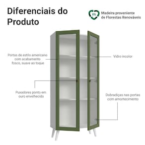 Com acabamento fosco de alta resistência, a estrutura e os pés são em Branco e as portas em Verde, refletindo o estilo americano com um toque moderno. A textura suave ao toque traz leveza e sofisticação para o ambiente. Os puxadores ponto em ouro envelhecido, feitos em metal resistente, adicionam personalidade e um charme único. As portas contam com dobradiças com amortecimento, garantindo um fechamento suave e silencioso, proporcionando mais comodidade e durabilidade no uso diário.