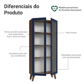 Com acabamento fosco de alta resistência, a estrutura e as pés são em tom amadeirado Rustic e as portas em Azul, refletindo o estilo americano com um toque moderno. A textura suave ao toque traz leveza e sofisticação para o ambiente. Os puxadores ponto em ouro envelhecido, feitos em metal resistente, adicionam personalidade e um charme único. As portas contam com dobradiças com amortecimento, garantindo um fechamento suave e silencioso, proporcionando mais comodidade e durabilidade no uso diário.