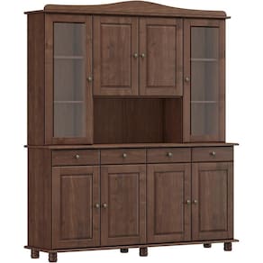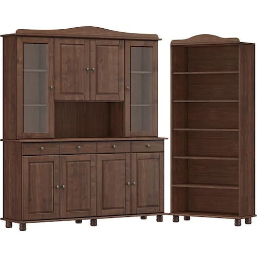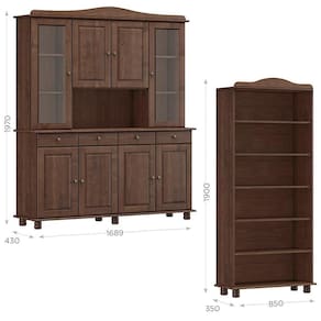 Cristaleira e Estante Livreiro, um conjunto projetado para quem busca móveis que combinam elegância e funcionalidade para complementar sua decoração. Produzido em madeira maciça de pinus de reflorestamento, sua estrutura robusta garante durabilidade e resistência. A Cristaleira de 168,9cm de largura, conta com 08 portas sendo 02 de vidro incolor, que possuem dobradiças com amortecimento. As gavetas com corrediças telescópicas proporcionam abertura suave e máxima praticidade para guardar itens menores, enquanto os puxadores metálicos adicionam um toque moderno ao design clássico do produto. Com amplo espaço para organização, a Estante de 85cm de largura é perfeita para acomodar livros, objetos decorativos ou itens de sua preferência. Ambos os móveis possuem pintura acetinada com verniz PU e UV, que realça a beleza natural da madeira enquanto protege contra desgastes do dia a dia, e pés torneados em madeira maciça que garantem estabilidade e charme artesanal. Estes móveis chegarão em sua casa separados em 04 volumes.