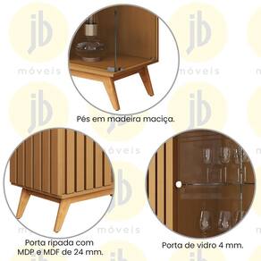 Material da estrutura: lateral e porta ripados em MDP e MDF de 24 mm; tampo, base e prateleira em MDP de 15 mm; porta, lateral e prateleira de vidro temperado de 4 mm com pés de madeira maciça;