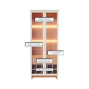 Diferenciais: Design moderno; Portas com centro de vidro emoldurado em MDP; Fita de LED atrás das prateleiras de vidro.