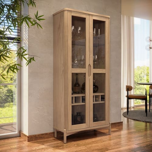 Características: Estrutura em Madeira Maciça de Pinus Taeda de Reflorestamento Pintura semi-brilho 02 Portas com dobradiças com amortecimento Puxadores cava Curvas caneladas Possui Led Touch superior interno Pés cilindricos Possui adega Vidro liso incolor Peso maximo suportado pela Prateleira de Vidro: 05Kg distribuidos Peso maximo suportado pela Prateleira: 10kg distribuídos