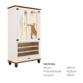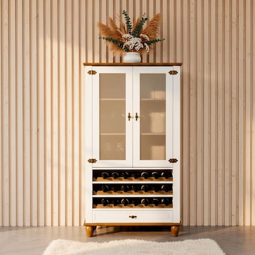 A cristaleira adega alta 2 portas e 1 gaveta combina elegância, funcionalidade e design diferenciado. Estruturada em MDF, com tampo, base e pés em pinus, destaca-se pela rusticidade e beleza natural. As portas com vidro espelhado conferem leveza e sofisticação, enquanto o interior possui 2 prateleiras. A gaveta com corrediça telescópica oferece praticidade, e a adega conta com 3 alturas, cada uma com 8 suportes para garrafas. Puxadores e dobradiças externos realçam o charme do móvel, que une robustez, estilo e personalidade em cada detalhe. Acabamento da Porta: Pintura UV Acabamento da Prateleira: Pintura UV Acabamento dos Pés: Verniz Altura dos Pés: 10,5 cm Altura Máxima dos Pés: 10.5000 Ambiente Principal: Sala de Jantar codigo_ean: 7900288244574 Complexidade da Montagem: Média: pode ser montado por mais de uma pessoa e/ou necessite de maior conhecimento para montagem Cor: Off White Cor da Porta: Off White Cor do Produto: Off White Cor dos Pés: Marrom Escala de Brilho: Semi-Brilho Escala de Brilho da Porta: Semi-Brilho Espessura do Vidro: 3 mm Informações Complementares: Cada prateleira da adega suporta até 10 Kg. Itens Inclusos: 1 Cristaleira, Kit Ferragens e Manual de Montagem Linha ou Coleção: Joy Manual de Montagem e Instalação: https://product-hub-prd.madeiramadeira.com.br/658678042/documents/cad5e089-5f4b-4697-8416-9c0d0301fa0b3238857543917588303252771.pdf Marca: Móveis Serpil Material da Porta: MDF Material da Prateleira: MDF Material Principal: MDF Necessita Montagem: Sim Origem do Produto: Nacional Peso: 59 kg Peso Máximo por Gaveta: 7 kg Peso Máximo por Prateleira: 10 kg Porta Taças: Não Possui Adega: Sim Possui Espelho: Não Possui Gavetas: Sim Possui iluminação: Não Possui Nicho: Não Possui Pés: 04 Possui Portas: Sim Possui Prateleiras: Sim Possui Vidro: Sim Quantidade de Garrafas da Adega: 10 ou mais Quantidade de Gavetas: 01 Gaveta Quantidade de Prateleiras: 05 Prateleiras Recomendações de Uso, Manutenção e Limpeza: Use um pano macio levemente umedecido. Não utilizar produtos abrasivos. Sapatas Niveladoras: Não Sistema de Montagem: Parafusos, Cavilhas, Minifix Suporta Até (kg): 10 kg Tipo de Corrediça da Gaveta: Metálica Telescópica Tipo de Dobradiça/Corrediça da Porta: Metálica Tipo de Porta: Abrir Tipo de Puxador da Porta: Externo