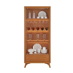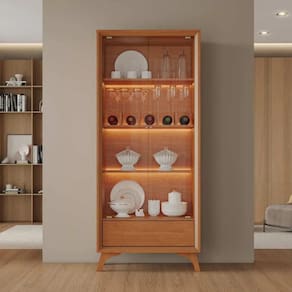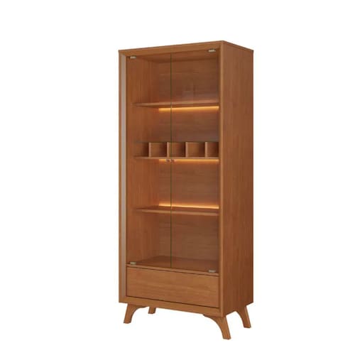 A Cristaleira Premium possui 2 portas de vidro temperado, prateleiras de madeira e 1 prateleira de vidro em cima da adega, sendo essa adega para 5 garrafas, 1 gaveta com corrediças telescópicas com fecho toque, proporcionando um grande espaço para organização e leveza no fechamento.  Além disto, possui seus pés em madeira maciça com regulagem de altura, trazendo muito mais charme e elegância para o produto. Invista na Cristaleira Premium e transforme seu espaço com requinte e praticidade.