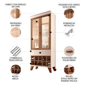 É uma Cristeleira Retrô super elegante que vale a pena conferir! Contém 2 portas de vidro emolduradas em MDF, 2 prateleiras de vidro, fundo com espelho, e também moldura superior e pés de madeira levemente angulados realçando o estilo retrô do móvel. Além de tudo isso, ainda contém o nicho adega onde você pode guardar suas bebidas! Possui estrutura de MDF que garante maior durabilidade e resistência! Demais, não é mesmo?