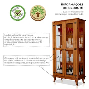 Apresentamos a Cristaleira Bella Luna, uma peça que combina elegância e funcionalidade para valorizar o seu ambiente. Com design sofisticado, é ideal para exibir suas coleções de cristais, porcelanas ou objetos decorativos, adicionando charme e organização ao espaço. Características Tipo: Cristaleira Modelo: Bella Luna Cores disponíveis: - Imbuia - Castanho Detalhes do Produto Material: Fabricada em madeira maciça taeda de reflorestamento de alta qualidade, garantindo durabilidade e resistência. Portas: Possui 2 portas com dobradiças que facilitam o acesso ao interior. Prateleiras: Equipadas com prateleiras de vidro, proporcionando um toque refinado e permitindo a visualização dos itens expostos. Dimensões do Produto Altura: 173 cm Largura: 80 cm Profundidade: 35 cm Observações Importantes Montagem: Produto entregue desmontado. Recomenda-se a contratação de um profissional para a montagem. Limpeza: Para a conservação do móvel, utilize pano levemente umedecido, evitando produtos abrasivos. Decorações: Os objetos decorativos NÃO vêm inclusos com o produto. ATENÇÃO AS IMAGENS SÃO MERAMENTE ILUSTRATIVAS E PODEM SOFRER VARIAÇÕES DE COR E PEQUENOS DETALHES DE ACORDO COM O SEU MONITOR, ILUMINAÇÃO DO AMBIENTE E ATÉ MESMO A SUA PERCEPÇÃO VISUAL. Marca: Não Informado