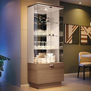 Cristaleira Aura 2 Portas de Vidro e 1 Gaveta - HB Móveis A Cristaleira Aura é a combinação perfeita de elegância e funcionalidade para sua sala de jantar ou espaço gourmet. Com estrutura em MDP e MDF de 25mm e 15mm, oferece resistência e acabamento sofisticado com pintura UV. Suas portas e laterais de vidro 6mm, fixadas com suportes cromados, garantem um visual moderno e sofisticado. Conta com espelhos ao fundo para realçar a decoração, prateleiras de vidro e MDF para acomodar taças e louças, além de uma luminária LED que valoriza ainda mais o ambiente. Possui puxadores com acabamento metálico fosco, dobradiças metálicas, gavetão com corrediças telescópicas e nicho adega embutido para 6 garrafas. Um móvel elegante e funcional para transformar seu espaço.