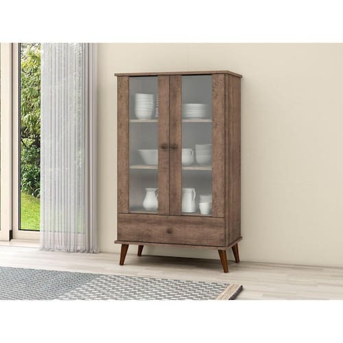 Cristaleira baixa retrô, 2 portas de vidro 4mm temperado, 1 gaveta com corrediça metálica, 3 prateleiras internas, pés arredondados de madeira maçiça, produzido em MDP 15mm, acabamento pintura impressão UV. Acabamento da Gaveta: Pintura UV Acabamento da Porta: Pintura UV Acabamento da Prateleira: Pintura UV Altura dos Pés: 14 cm Ambiente Principal: Sala de Jantar Complexidade da Montagem: Baixa: pode ser montado por uma pessoa sozinha Cor: Rústico Cor do Produto: Rústico Cor Interna: Rústico Escala de Brilho: Fosco Escala de Brilho da Porta: Fosco Escala de Brilho da Prateleira: Fosco Espessura do Vidro: 4 mm Gaveta com Chave: Não Itens Inclusos: 1 Cristaleira, Kit Ferragens e Manual de Montagem Manual de Especificação Técnica: https://cdn2.madeiramadeira.com.br/atributo/movelbento/569343-rt-3107.pdf Manual de Montagem e Instalação: https://cdn2.madeiramadeira.com.br/atributo/movelbento/569344-rt-3107.pdf Material da Gaveta: MDP Material da Porta: Vidro Material da Prateleira: MDP Material do Puxador da Porta: Cromado Material dos Pés: Madeira Maciça Material Principal: MDP Necessita Montagem: Sim Origem do Produto: Nacional Peso: 3 kg Peso Máximo por Gaveta: 5 kg Peso Máximo por Prateleira: 10 kg Porta-garrafas: Não Possui Adega: Não Possui Espelho: Não Possui Gavetas: 01 Possui iluminação: Não Possui Nicho: Não Possui Pés: 04 Possui Portas: 02 Possui Prateleiras: 02 Possui Rodízio: Não Possui Vidro: Sim Recomendações de Uso, Manutenção e Limpeza: Limpeza: utilize um pano levemente umedecido, seguido de pano seco. Não utilizar produtos químicos ou abrasivos, pois pode danificar o acabamento do móvel. Sapatas Niveladoras: Não Sistema de Montagem: Parafuso, cavilha e minifix Suporta Até (kg): 50 kg Tamanho: Tipo de Corrediça da Gaveta: Metálica Simples Tipo de Dobradiça/Corrediça da Porta: Aço Tipo de Porta: Bater Tipo de Puxador da Gaveta: Externo Tipo de Puxador da Porta: Externo