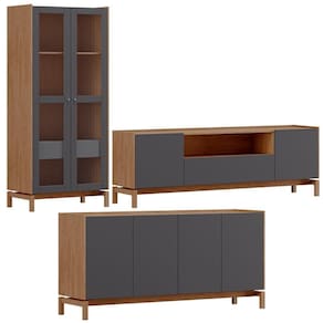 O conjunto Cristaleira, Balcão Buffet e Rack une sofisticação, funcionalidade e resistência em peças que se complementam com harmonia. Todos são produzidos em madeira maciça de pinus de reflorestamento, com acabamento em pintura acetinada PU e UV que valoriza o visual e garante durabilidade. O balcão buffet, com 165 cm de largura, conta com tampo e frentes de portas e gaveta em MDF, 1 gaveta com corrediças telescópicas e 2 prateleiras internas, sendo ideal para a organização de objetos no seu ambiente. A cristaleira, com 80 cm de largura, possui 2 portas com vidro canelado incolor, dobradiças com amortecimento, 1 gaveta interna com corrediças telescópicas e 2 prateleiras em madeira maciça, perfeita para expor itens com elegância. Já o rack, com 180 cm de largura, conta com tampo, frentes de portas e gaveta em MDF, 2 portas, 1 gaveta com corrediças telescópicas, 2 prateleiras internas e dobradiças com amortecimento, além de suportar TVs de até 65 polegadas, sendo uma excelente escolha para compor sua sala com estilo e praticidade. Todos os móveis possuem pés flutuantes que conferem um toque moderno ao conjunto. Estes móveis chegarão em sua casa separados em 05 volumes.