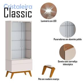 A cristaleira da linha Classic oferece um toque de elegância e funcionalidade para qualquer ambiente. Com duas portas em vidro, exibe seu interior de forma sofisticada. As três prateleiras também em vidro proporcionam amplo espaço para organizar seus objetos. Além disso, possui uma gaveta com corrediça telescópica, garantindo um deslize suave e fácil acesso aos seus pertences. A inclusão de uma luminária LED realça a beleza, criando um ambiente acolhedor. Produzido pela Imcal, é desenvolvido em MDP com materiais de alta qualidade garantindo mais durabilidade e resistência. Combinando estilo com design clássico será a escolha perfeita para quem busca uma peça que una organização e praticidade ao seu ambiente. Confira e garanta o seu!