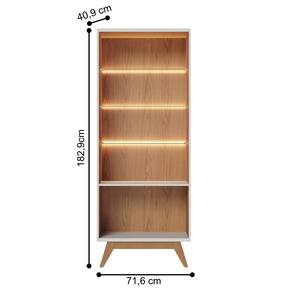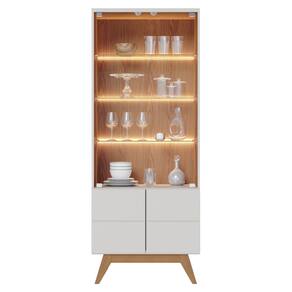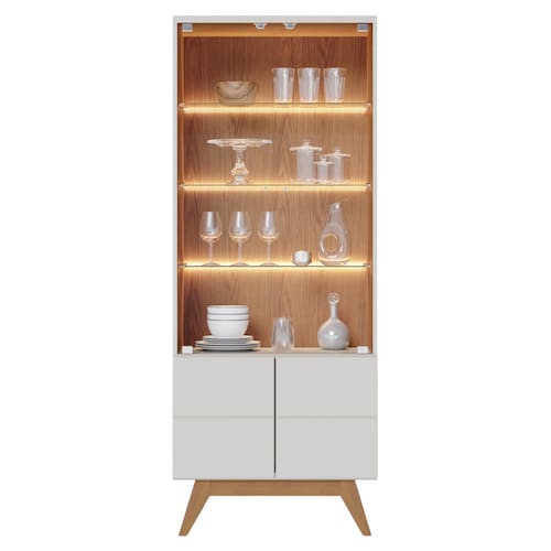 Feita em MDP 12/15mm. Contém 2 portas de vidro e 2 com detalhes chanfrados e 3 prateleiras de vidro e luz de LED refletida