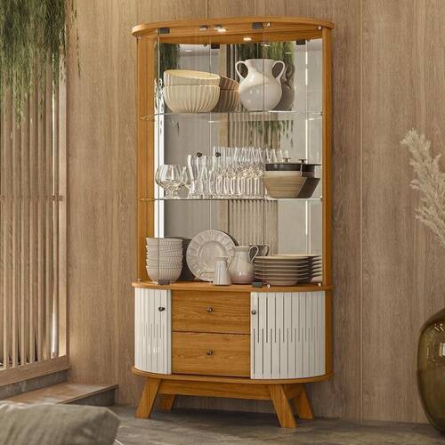 A Cristaleira Moss combina painéis em MDP de 15 e 25mm, portas íveis em MDF e detalhes curvos no chapéu, tampo e base, criando um visual elegante e moderno. As portas com dobradiças metálicas e puxadores em poliestireno garantem durabilidade e praticidade. Inclui luminária de LED, espelhos, gavetas com corrediças telescópicas, laterais e portas de vidro de 5mm, prateleiras de vidro de 6mm e pés palito, para um toque final de estilo e requinte.
