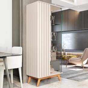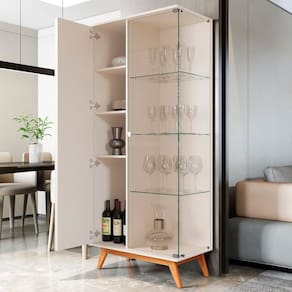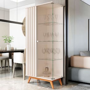 Cristaleira Moderna com Estrutura Lateral e Portas Ripadas de 24mm. Porta, lateral e prateleira de vidro temperado 4mm. Pés e travessas em madeira maciça. Produto entregue desmontado, montagem de responsabilidade do cliente. Acompanha uma cristaleira, kit ferragens e um manual de montagem.