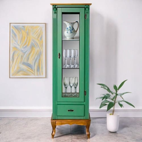 A Cristaleira de Madeira 1079-E é uma peça sofisticada e funcional, perfeita para valorizar sua decoração. Com uma estrutura robusta em madeira, ela conta com uma porta de vidro lateral e fundo espelhado, proporcionando um efeito elegante e ampliando o ambiente. A cristaleira possui uma gaveta para armazenar itens pequenos e três prateleiras internas que oferecem amplo espaço para exibir objetos decorativos. Seus pés no estilo Luiz XV conferem um toque de requinte, tornando este móvel uma excelente escolha para quem busca aliar beleza e praticidade em sua casa.
