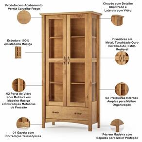 Cristaleira De Madeira Com Vidro 2 Portas 1 Gaveta Lira M06 Carvalho Fosco - Lyam Decor