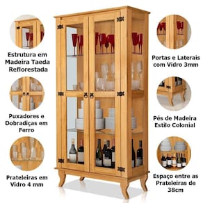 - Pintura: Portas e Laterais de Vidro; Puxadores e Dobradiças de Ferro; Pés de Madeira em Estilo Colonial; Prateleiras de Vidro;
