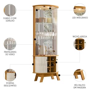 Com seu design sofisticado e funcional, ela se destaca pela capacidade de organizar e exibir seus objetos decorativos com estilo. Com quatro portas de vidro deslizantes, a Cristaleira de Vidro permite uma visualização clara dos itens armazenados, enquanto mantém tudo protegido e organizado. As prateleiras de vidro e os espelhos realçam a beleza dos objetos expostos, criando um efeito visual encantador. Os quatro pés garantem estabilidade e um toque moderno ao móvel. Fabricada em MDP, a Cristaleira é resistente e durável. Com iluminação LED integrada e puxadores em plástico, ela oferece praticidade e um acabamento sofisticado, a Cristaleira com Adega proporciona um espaço compacto e elegante para a exposição de cristais e objetos decorativos, destacando-os de forma única e charmosa.