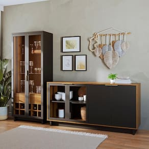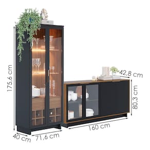 Cristaleira Guanabara e Balcão Buffet Vitoria, design minimalista e funcional para transformar sua sala de jantar. Estrutura em MDP/MDF (25/15 mm) e acabamento em pintura UV texturizada. Possui portas em vidro (5 mm) com molduras em MDF e puxadores em alumínio (dourado), fitas LED, adega interna para 10 garrafas, gaveta com corrediças telescópicas e prateleiras internas (Cristaleira em Vidro 5mm e Balcão com prateleiras reforçadas). Estes produtos serão entregues em 5 volumes.