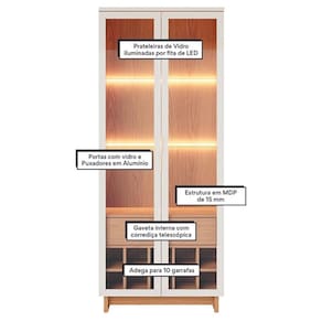 A Cristaleira Guanabara fabricado pela Colibri, com um design cuidadosamente elaborado oferece estilo e praticidade, desenvolvida para armazenar utensílios de louças sendo uma ótima escolha para deixar seu ambiente muito mais organizado e elegante. Possui uma gaveta espaçosa com corrediças telescópicas que trazem mais suavidade ao abrir e fechar. Seu destaque fica nas portas em vidro com moldura estilo retro, e com puxadores metálicos dourados permitindo que todo conteúdo interno fique a vista. Duas prateleiras em vidro equipadas por fita led dando aquele toque aconchegante e sofisticado para seu ambiente.Possui uma adega com capacidade de acomodar até dez garrafas. Sua combinação de funcionalidade e praticidade sem abrir mão do estilo será a escolha ideal para deixar seu ambiente mais belo! Garanta já o seu!