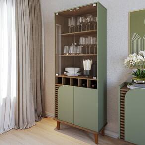 Descubra a sofisticação da Cristaleira Jurerê, com design marcado por pés de madeira maciça e linhas orgânicas. Suas duas portas de vidro temperado (5mm) revelam uma adega para 05 garrafas, enquanto apliques ripados e quinas arredondadas na base conferem um toque único. Os puxadores dourados completam a fusão perfeita entre o retrô e o contemporâneo. Transforme seu espaço com esta peça que une funcionalidade e estilo em cada detalhe.