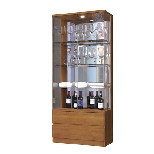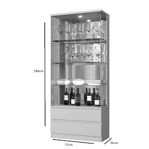 Tampo maciço de 25 mm, luminária LED bivolt, cantoneira para fixar o tampo na parede, prateleira de vidro temperado, puxador em alumínio bronze, espelho para dar amplitude ao ambiente, lateral de vidro temperado, porta de vidro tempero, base maciça de 25 mm, gavetas com corrediças telescópicas.Altura: 184 cmLargura: 71 cmProfundidade: 36 cm