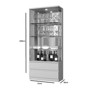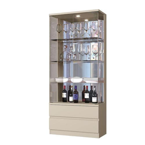 Tampo maciço de 25 mm, luminária LED bivolt, cantoneira para fixar o tampo na parede, prateleira de vidro temperado, puxador em alumínio bronze, espelho para dar amplitude ao ambiente, lateral de vidro temperado, porta de vidro tempero, base maciça de 25 mm, gavetas com corrediças telescópicas.Altura: 184 cmLargura: 71 cmProfundidade: 36 cm