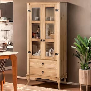 Madeira Maciça Pinus de Reflorestamento Sustentável, resistente e de alta qualidade, garantindo um móvel durável e ecologicamente responsável. 2 Portas com Dobradiças Metálicas Estrutura reforçada para maior durabilidade e fácil acesso ao interior da cristaleira. Vidros de 3mm Permite expor taças, copos, louças e peças decorativas com elegância e segurança. 2 Gavetas com Corrediças em Madeira e Puxadores Metálicos Armazenamento extra para guardar talheres, jogos americanos e utensílios essenciais. 3 Nichos para Organização Perfeito para dispor garrafas, temperos ou objetos decorativos de forma prática e acessível. Acabamento em Pintura UV com Brilho Semi Fosco Proteção contra desgastes, realçando o design rústico e sofisticado do móvel. Design Rústico e Versátil Ideal para compor salas de jantar, cozinhas ou áreas gourmet, trazendo um toque de charme e aconchego ao ambiente.