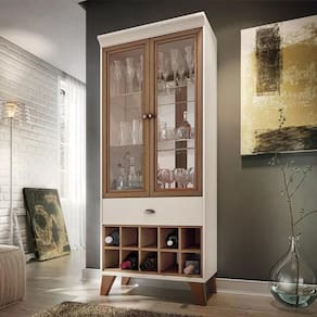ESPECIFICAÇÕES: Produto em MDP e MDF de 25mm e 15mm Pintura UV 2 Prateleiras de vidro 6mm com suportes cromados Espelho atrás da prateleira de vidro de 3 mm 2 Portas de vidro emolduradas em MDF revestidas com papel melamínico Puxador com acabamento metálico na cor bronze Moldura superior robusta valorizando e realçando os aspectos retrô do móvel Pés de madeira maciça levemente angulados com acabamento envernizado Adega central para 10 garrafas