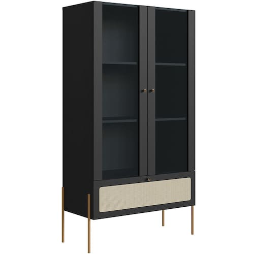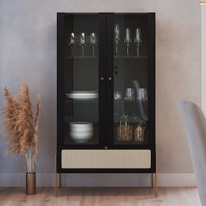 A robustez da estrutura e dos pés metálicos estilo industrial contrastam com a delicadeza das portas de vidro e com o aplique de telinha sintética na gaveta, dando origem a uma cristaleira com traço artesanal, suave e convidativo. Seja para compor a sala de jantar ou até mesmo a sala de estar ou área gourmet, essa cristaleira multifuncional tanto servirá de apoio no momento das refeições, como garantirá organização e fácil acesso.