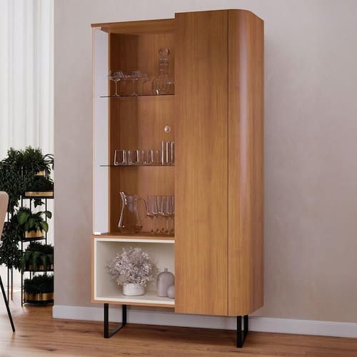 Os cantos curvos orgânicos e o puxador pontual discreto transformam a peça em uma Cristaleira elegante, perfeita como Móvel em ambientes contemporâneos.