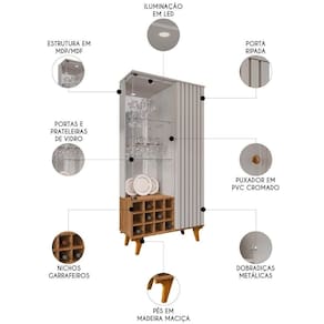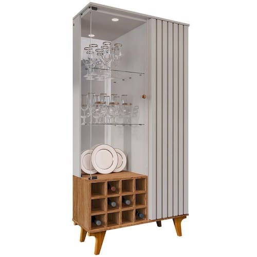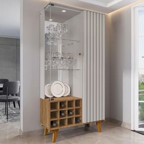 A Cristaleira Com Adega conta com nichos ideais para armazenar garrafas de forma segura e organizada, além de um espaço interior com divisões bem distribuídas, que oferecem praticidade no dia a dia e facilitam a organização de diversos itens, como taças, utensílios ou objetos decorativos .