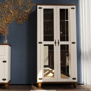Os puxadores e dobradiças com acabamento de ouro envelhecido introduzem um charme vintage, enriquecendo o estilo retrô com uma nuance de luxo. Os pés, robustos e esculpidos em madeira maciça, garantem uma base firme e adicionam um toque de elegância provençal ao design. As gavetas são desenhadas para aumentar a durabilidade. Complementando a estrutura, as portas e divisórias são confeccionadas com painéis de MDF de 15mm, proporcionando uma construção sólida e resistente.