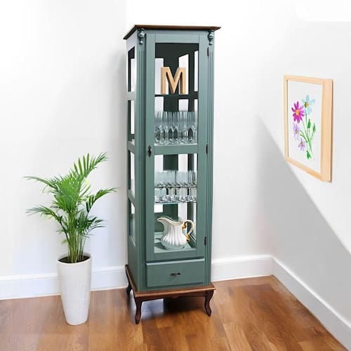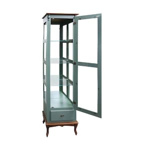 - 01 Cristaleira de Madeira 1 Porta 1 Gaveta 3 Prateleiras Lateral com Vidro Fundo de Espelho Pés Luiz XV