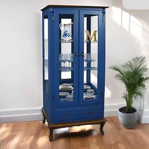 - 01 Cristaleira de Madeira 2 Portas 1 Gaveta 2 Prateleiras Lateral com Vidro Fundo com Espelho Pés Luiz XV