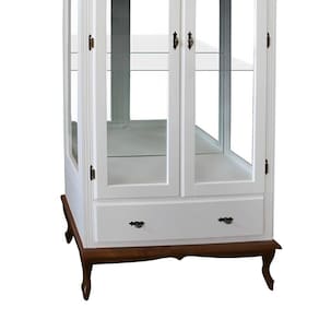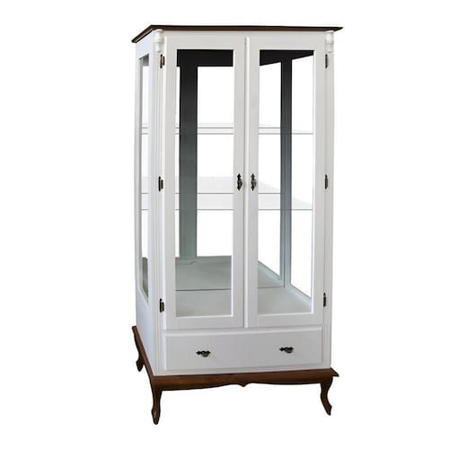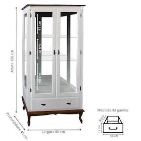 - 01 Cristaleira de Madeira 2 Portas 1 Gaveta 2 Prateleiras Lateral com Vidro Fundo com Espelho Pés Luiz XV
