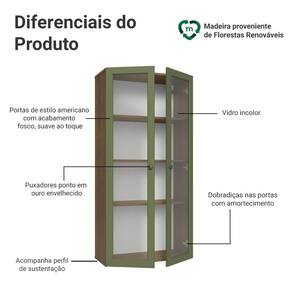 O acabamento fosco de alta resistência da estrutura é em amadeirado Rustic e das portas em Verde, refletindo o estilo americano com um toque moderno. Possui uma textura suave ao toque, trazendo leveza e sofisticação ao ambiente. O destaque vai para os puxadores ponto em ouro envelhecido, feitos com metal resistente, que adicionam personalidade e um charme único.