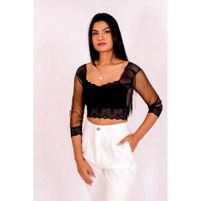 Cropped em Renda mangas em Tule, possui mangas longas estilo princesa em tule e punho com detalhe em renda. Possui bojo e costura dropeada entre os seios. A manga princesa além de dar um ar romântico ao look, também equilibra o volume do quadril trazendo volume aos ombros. O cropped em renda é perfeito para compor looks mais românticos e sensuais. Código do Produto: 10235046 Marca: Khalli