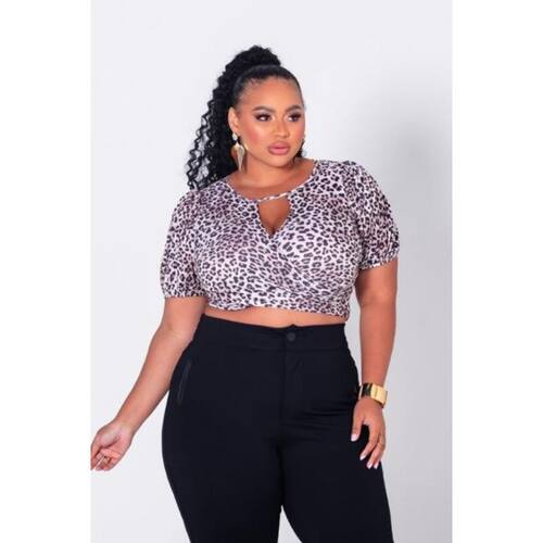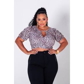 ESPECIFICAÇÕES DO MODELO: -Cropped com estampa oncinha -Modelo plus size -Com decote V -Com mangas curtas e detalhe franzido -Confortável -Flexível -Perfeita para compor várias opções de looks