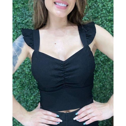 Cropped Slim Babado na Alça e Franzido na Frente Preto