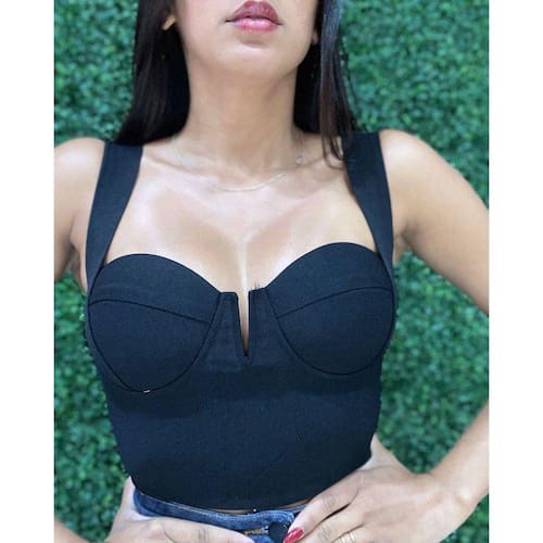 Detalhe: Cropped Com Abertura em V Alças Laterais Com Bojo e Zíper Atrás.