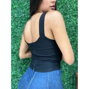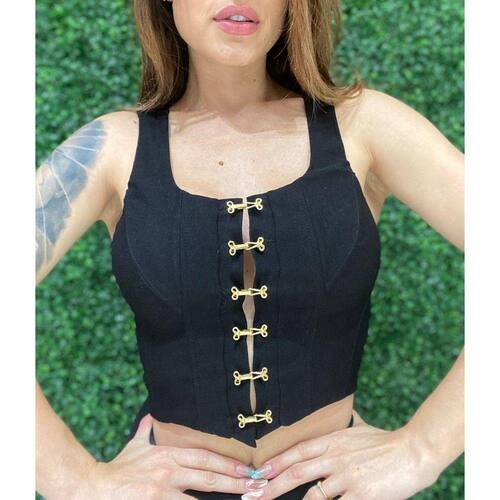 Detalhe: Cropped Travas Frontais na Cor Dourada Com Bojo e Zíper Atrás.