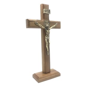 CRUCIFIXO DE MESA E PAREDE MADEIRA METAL SÃO BENTO OURO VELHO 26 CM