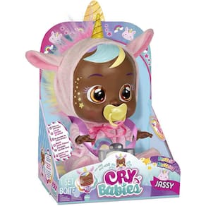Conheça Cry Baby Jassy. Ela chora lágrimas de verdade e faz sons realistas de bebê quando você tira sua chupeta! Dê-lhe doces abraços ou gentilmente deitá-la para impedi-la de chorar. Ela também vem com sua própria onesie temática mutável . Cry Babies são tão divertidos e promovem brincadeiras imaginativas!
