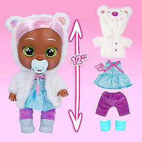 Conheça o novo bebê chorão dressy perolado! Ela tem cabelo rosa pastel enraizado, olhos verdes brilhantes. Pearly está usando uma roupa elegante bonito - um vestido azul brilhante, emparelhado com leggings roxas, uma jaqueta fofinha branca adornada com orelhas de animal e sapatos azuis combinando! Como todos os bebês chorões, ela chora lágrimas de água reais e faz 10 sons de bebê sem sua chupeta! Bebês chorões são mais leves do que nunca tornando mais fácil embalar e acalmá-la. Pearly inclui uma roupa bonita com um par de sapatos e chupeta combinando. Idade recomendada 18+ meses.