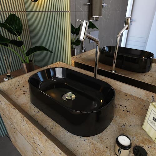 Formato: Oval | Tipo de Cuba: Apoio | Material: Mármore Sintético | Acabamento: Hard Lacca PU | Escala de Brilho: Brilho | Possui Ladrão: Não | Possui Furação para Torneira: Sim | Diâmetro do Furo para Torneira: (32mm) - DN 32 | Diâmetro do Furo para Válvula: (40mm) - DN 40 | Limite de unidades por venda: É possível comprar até 1 unidade por venda. | Quantidade máxima de pedido: 1 | Baterias são necessárias?: false Cor: Preto