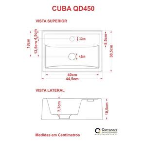 Sobre o ProdutoCuba de Apoio Retangular Q45 44,5X30,5cm AmareloDescrição do ProdutoA cuba Q45 tem seu design retangular, especial para pequenos espaços e um excelente escoamento de água, é fabricada em mármore sintético com acabamento em Hard Lacca PU, material bem semelhante a louça, muito resistente e mais econômico!!Itens Inclusos:1 Cuba de ApoioInformações Logísticas:Vol.01 - Comp.: 49cm - Prof.: 41cm - Alt.: 17,5cm - Peso Bruto: 5,7KgObservações:Não acompanha acessórios decorativos. Imagens meramente ilustrativas.Informações Técnicas / Características:- Cor: Amarelo- Marca: Compace- Modelo: CAQD450- Linha: Conect- Formato: Retangular- Tipo de Cuba: Apoio- Material: Mármore Sintético- Acabamento: Hard Lacca PU- Escala de Brilho: Brilho- Possui Ladrão: Não- Possui Furação para Torneira: Sim- Diâmetro do Furo para Torneira: (32mm) - DN 32- Diâmetro do Furo para Válvula: (40mm) - DN 40 - Comprimento: 44,5cm- Largura: 30,5cm- Altura: 10,5cm - Peso Líq.: 5,1Kg- Recomendações de Uso, Manutenção e Limpeza: Utilize flanela seca ou pano macio, levemente umedecido com água. Evite contato com produtos químicos e abrasivos (solventes, thinner, acetona etc) e não utilize nenhum tipo de esponja de aço. Para maior brilho, recomendamos a utilização de cera automotiva n 2.- Necessita de Montagem: Sim / Acompanha Manual de Montagem- Complexidade da Montagem: Média: pode ser montado por mais de uma pessoa e/ou necessite de maior conhecimento para montagem.- Garantia: 6 meses Formato: Retangular | Tipo de Cuba: Apoio | Material: Mármore Sintético | Acabamento: Hard Lacca PU | Escala de Brilho: Brilho | Possui Ladrão: Não | Possui Furação para Torneira: Sim | Diâmetro do Furo para Torneira: (32mm) - DN 32 | Diâmetro do Furo para Válvula: (40mm) - DN 40 | Limite de unidades por venda: É possível comprar até 1 unidade por venda. | Quantidade máxima de pedido: 1 | Baterias são necessárias?: false Cor: Azul Turquesa