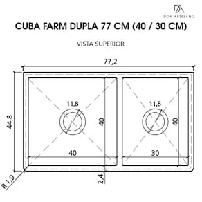 MARCA: DON ARTESANO LINHA: PREMIUM CÓDIGO SKU: FARM77 MATERIAL: SUPERFÍCIE SÓLIDA MINERAL DIMENSÕES EXTERNAS: 77 X 45 X 19,2 CM DIMENSÕES INTERNAS: 40/30 X 40 X 18 CM ESPESSURA: 1,2 CM ACABAMENTO: ACETINADO INSTALAÇÃO: SEMI-ENCAIXE OU EMBUTIR ANTI-RUÍDO: NO FUNDO E NAS LATERAIS FURAÇÃO DA VÁLVULA: 4 ½" (polegadas) ACEITA TRITURADOR: SIM PESO DA CUBA: 20 kg VOLUME: 50 L
