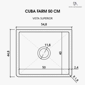 MARCA: DON ARTESANO LINHA: PREMIUM CÓDIGO SKU: FARM50 MATERIAL: SUPERFÍCIE SÓLIDA MINERAL DIMENSÕES EXTERNAS: 55 X 45 X 19,2 CM DIMENSÕES INTERNAS: 50 X 40 X 18 CM ESPESSURA: 1,2 CM ACABAMENTO: ACETINADO INSTALAÇÃO: SEMI-ENCAIXE OU EMBUTIR ANTI-RUÍDO: NO FUNDO E NAS LATERAIS FURAÇÃO DA VÁLVULA: 4 ½" (polegadas) ACEITA TRITURADOR: SIM PESO DA CUBA: 12,5 KG VOLUME: 36 L