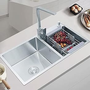 Seu design quadrado e a configuração de pia dupla proporcionam uma estética moderna e funcionalidade aprimorada para atividades culinárias.