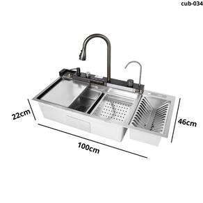 Esta cuba gourmet de cozinha em aço inox 304 é o ápice da modernidade e funcionalidade, projetada para quem valoriza praticidade e sofisticação. Com um sistema automatizado e controle por botões, possui dois jatos de água em cascata para lavagem de louças e alimentos, adicionando um toque elegante ao design. Inclui também um lavador de copos integrado, facilitando a limpeza de utensílios delicados, além de uma torneira com três tipos de jato, adaptando-se às diferentes necessidades de uso.